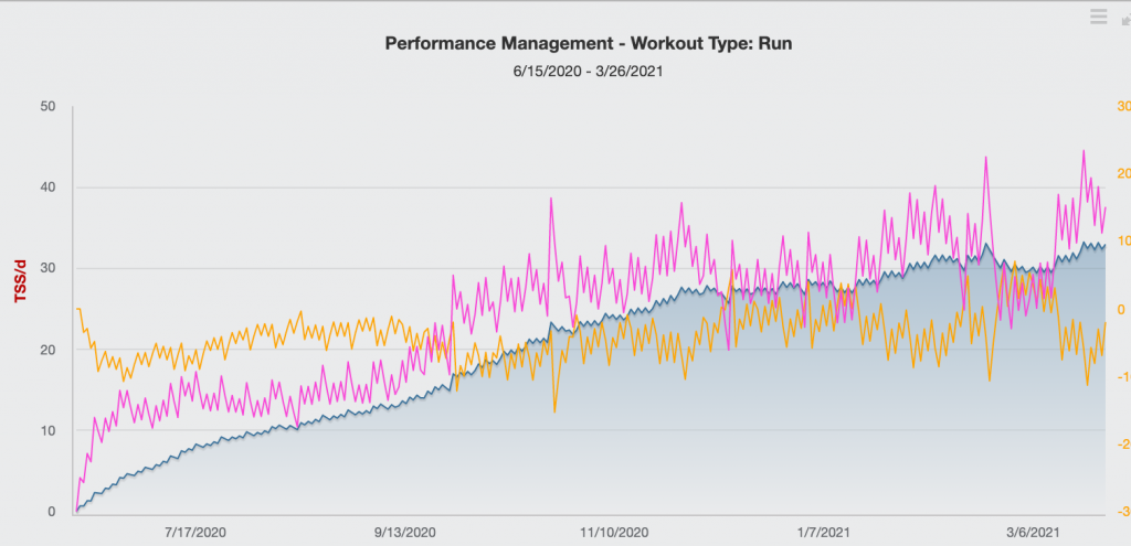 A kék görbe mutatja a fittséget, a rózsaszín az edzések generálta fáradtságot, a sárga pedig a formát. Egyértelműen követhető tehát a fejlődés.