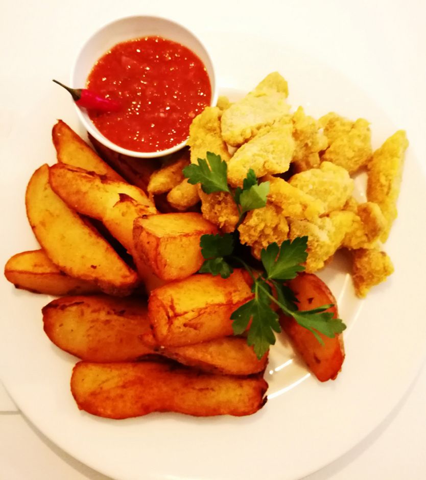 Kis filózás után a brokkoli krémleves és a kukoricabundában sült szejtáncsíkok steakburgonyával, csípős mártással lett a befutó.